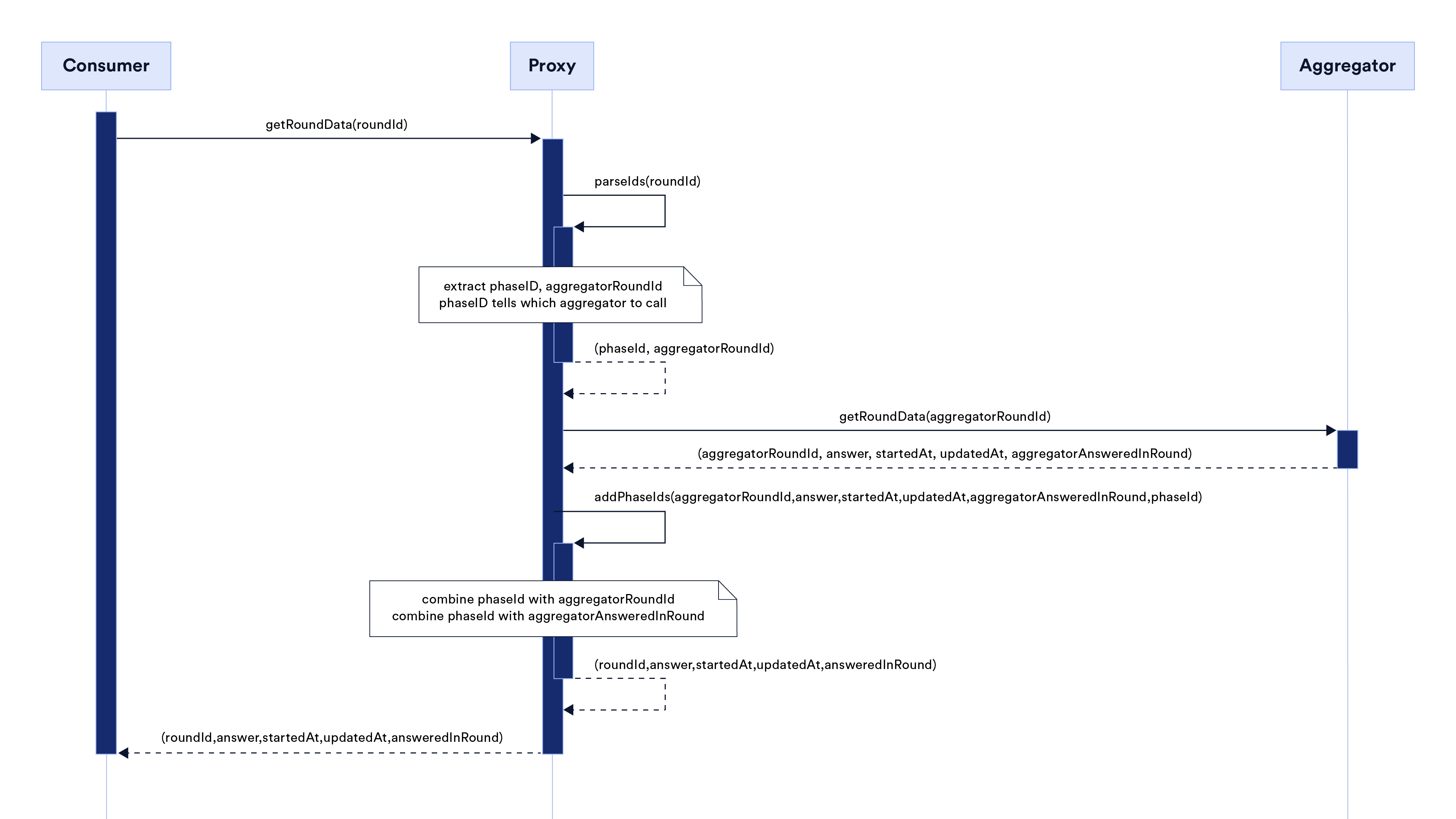 As shown in the following sequence diagram, to get historical data, call the getRoundData function and provide roundId as a parameter.